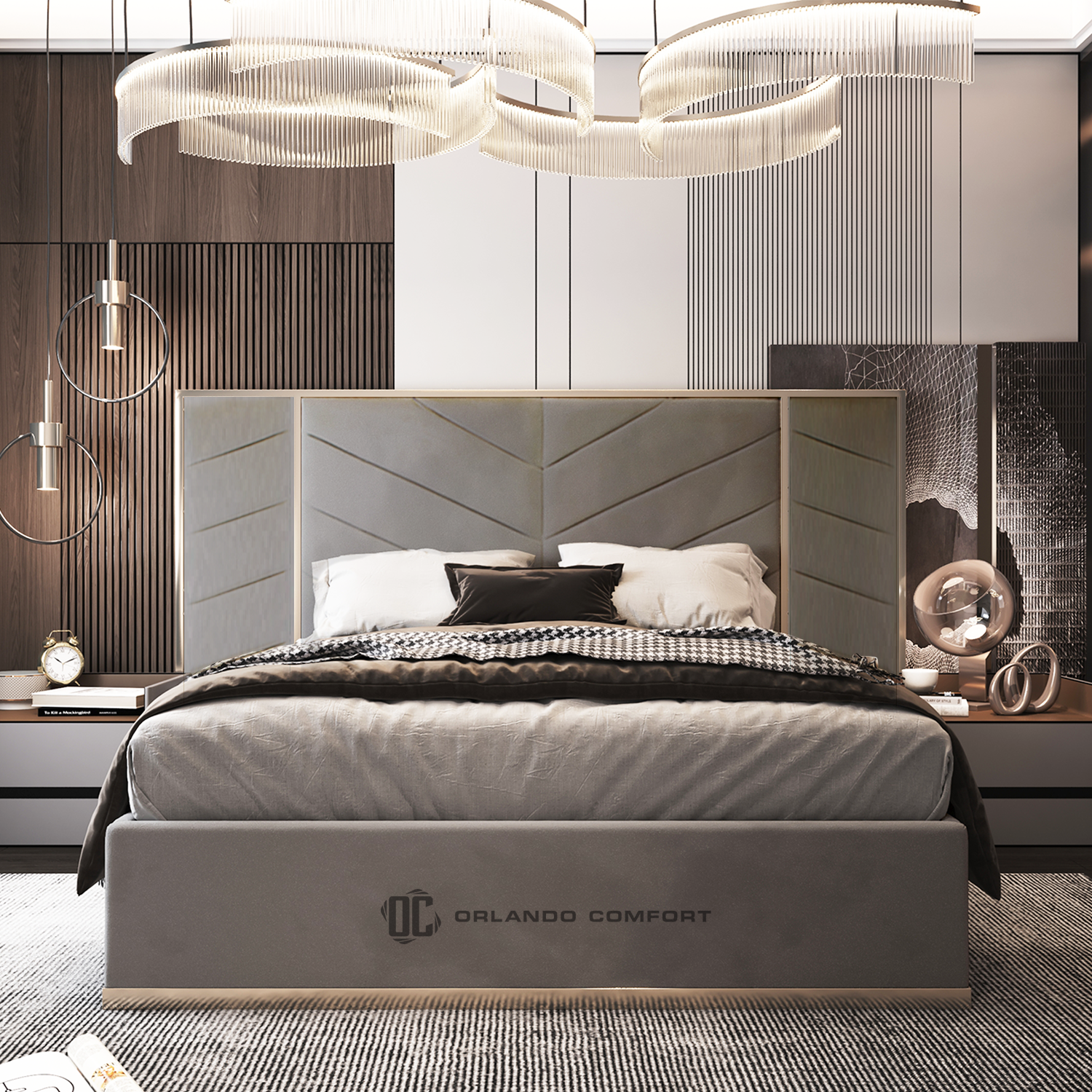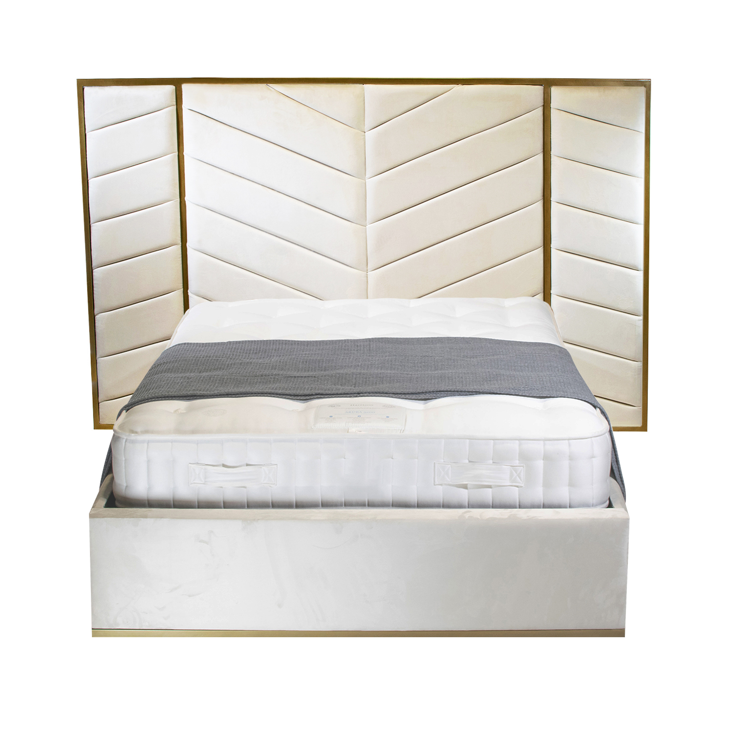 The panels in the centre of the bed are customisable with a choice of different upholstery designs ranging from classic chesterfield pleated upholstery to modern geometric chevrons.